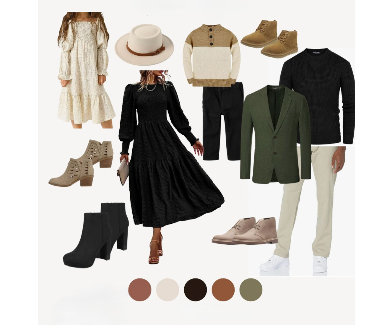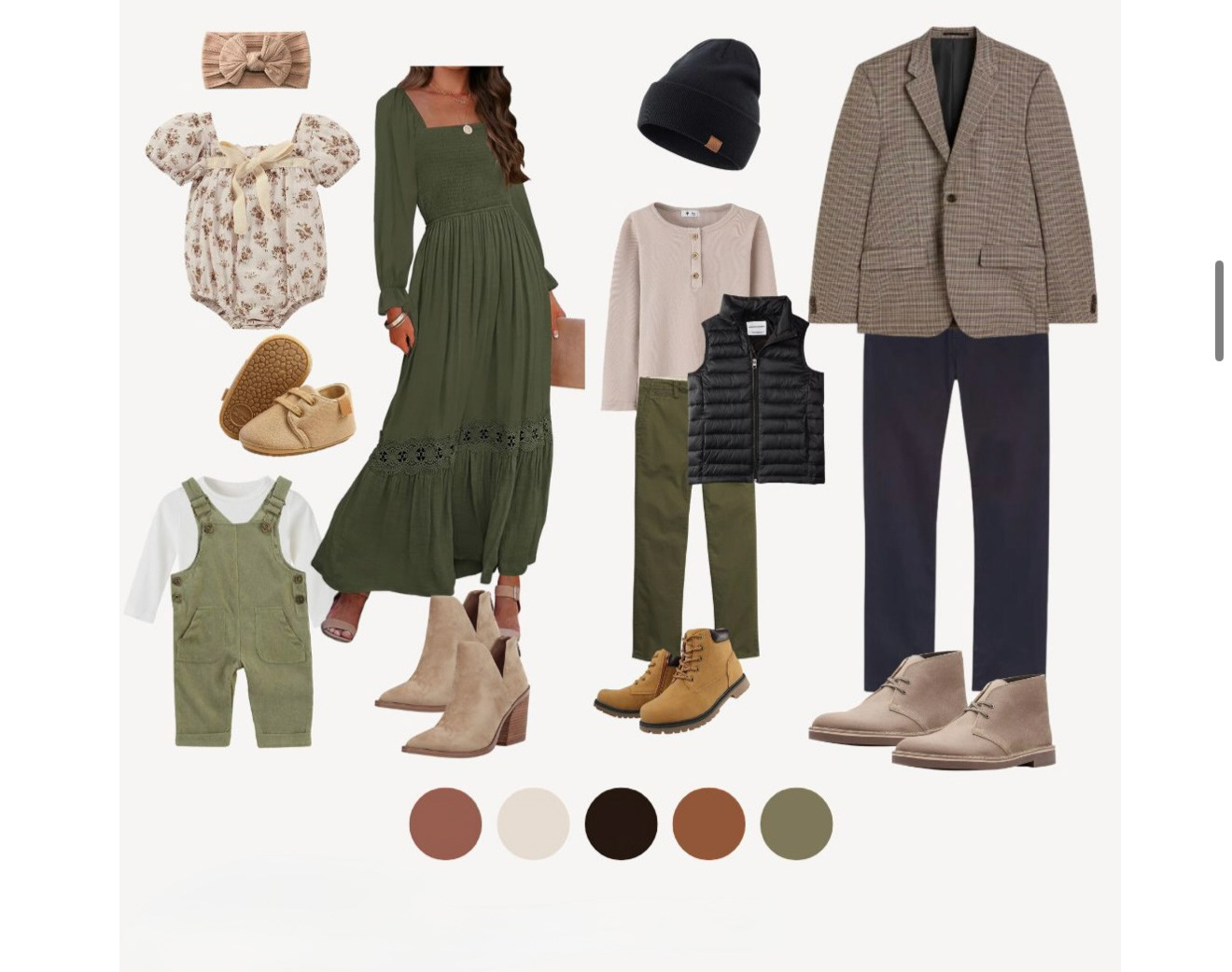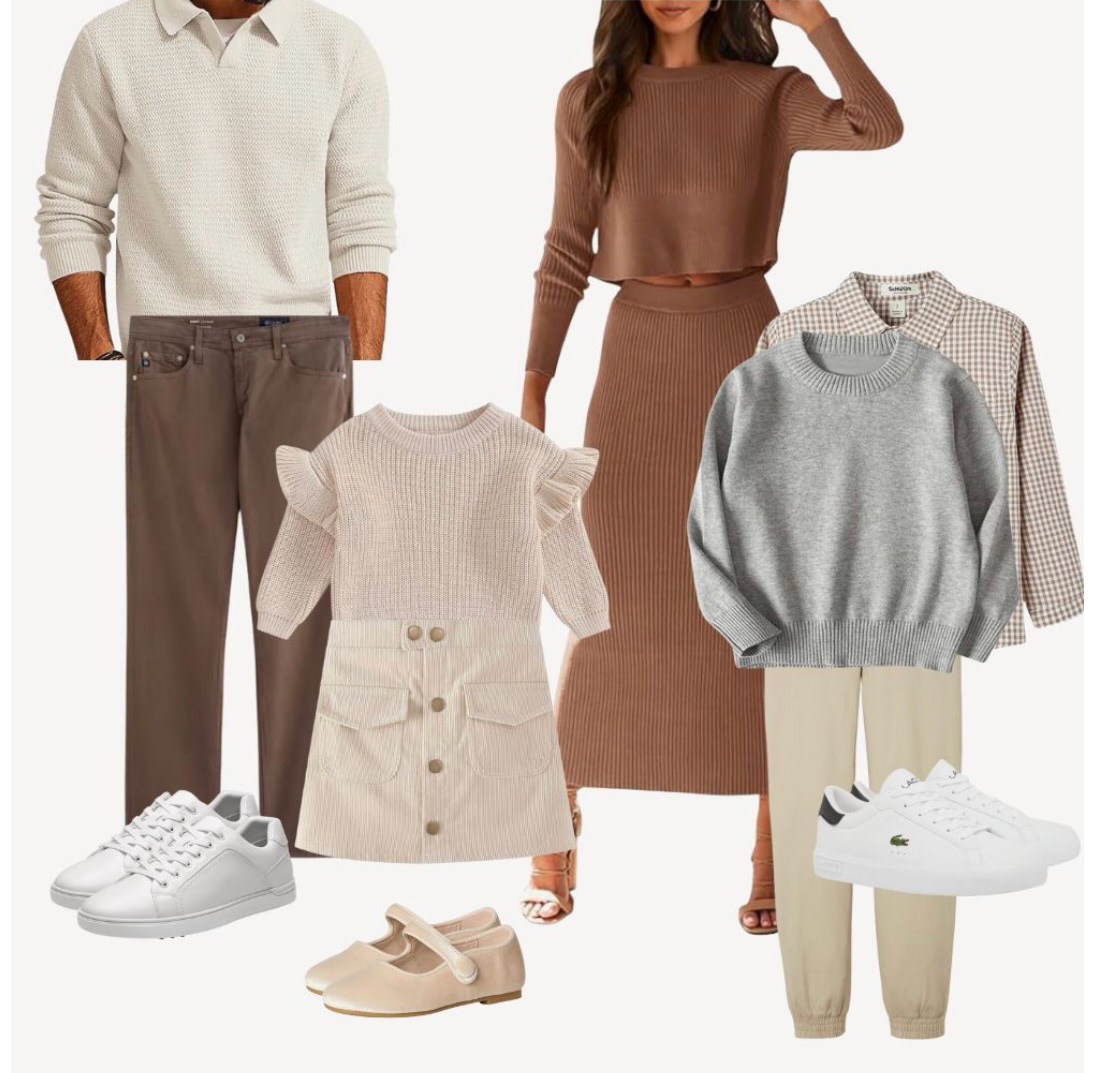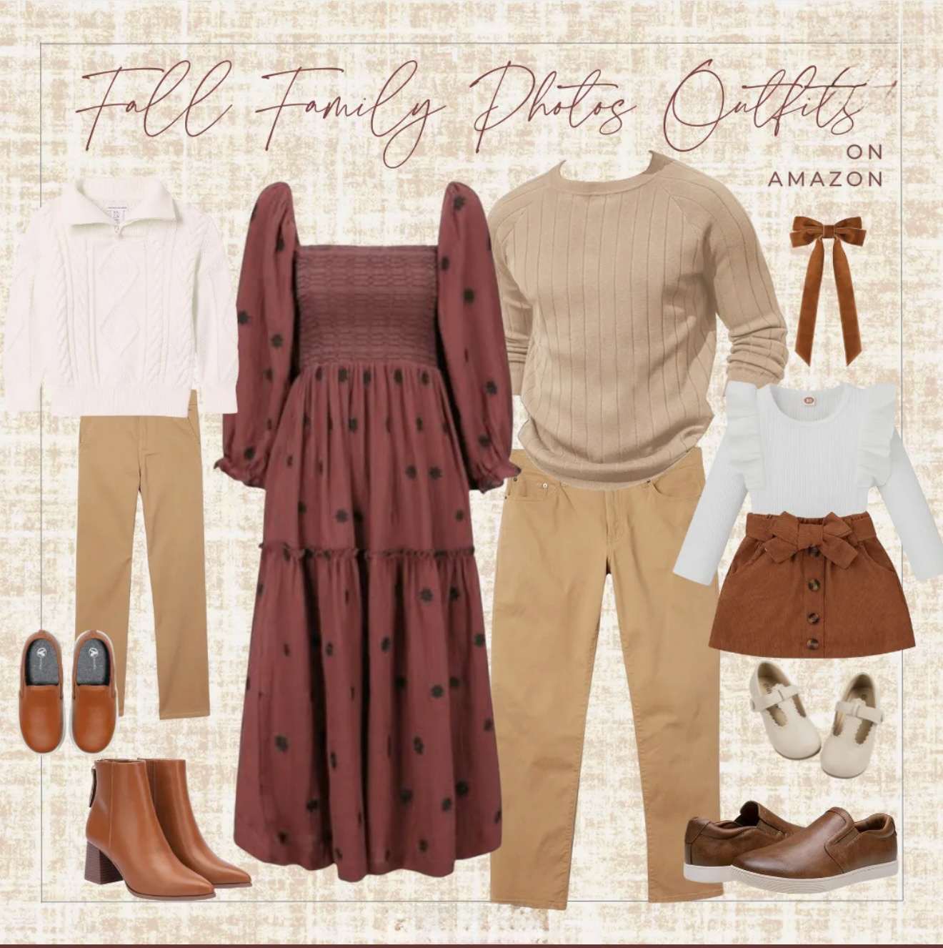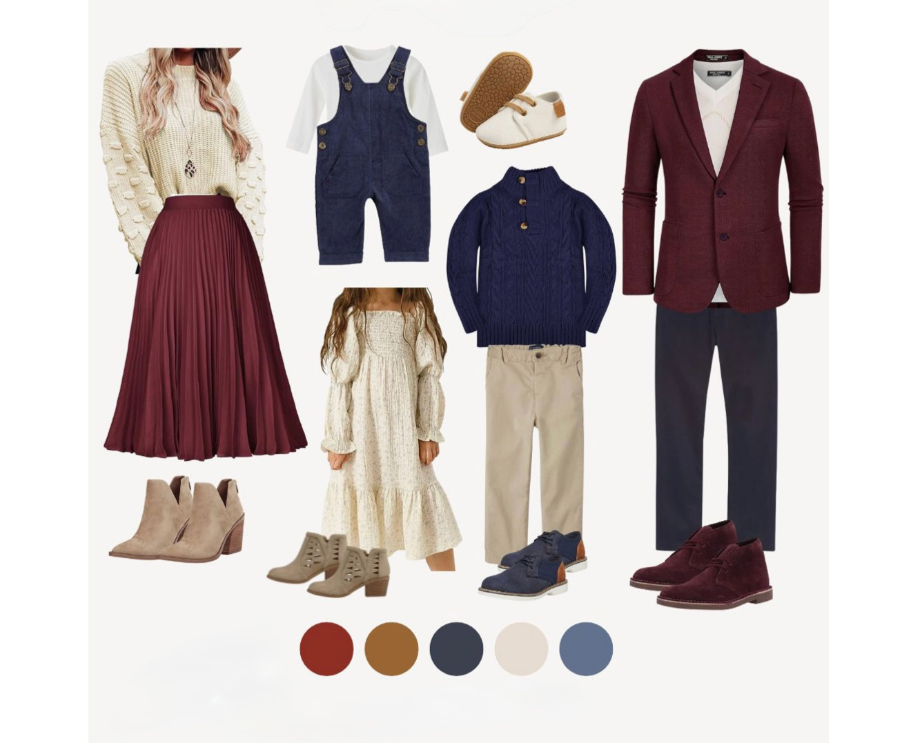 What’s in for 2025? Picture warm and earthy tones like rustic rust, enchanting olive green, and deep, cozy burgundy. These colors are pure fall magic, and they’re going to make your photos pop no matter what setting you choose for your family photos! Oversized sweaters, layered looks, and snuggly textures are great for styling fall family picture outfits.